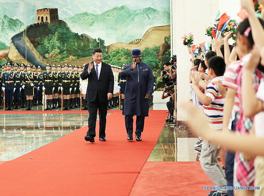 El presidente de China, Xi Jinping, sostiene una ceremonia de bienvenida para el presidente de Sierra Leona, Julius Maada Bio, previo a sus conversaciones, en el Gran Palacio del Pueblo en Beijing, capital de China, el 30 de agosto de 2018. (Xinhua/Li Tao)