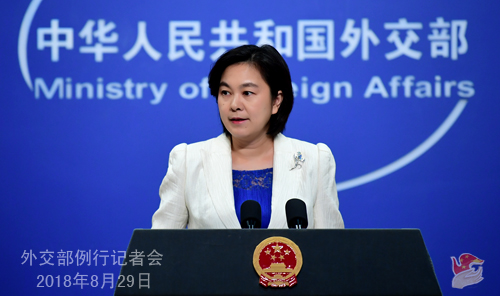 Hua Chunying, portavoz del Ministerio de Relaciones Exteriores de China, durante la rueda de prensa habitual. Beijing, 29 de agosto del 2018.