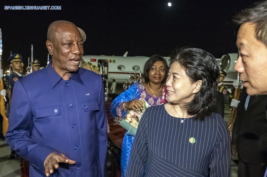 BEIJING, agosto 30, 2018 (Xinhua) -- El presidente de Guinea, Alpha Conde (i-frente), llega para asistir a la Cumbre de Beijing del Foro de Cooperación China-Africa (FOCAC), en Beijing, capital de China, el 30 de agosto de 2018. (Xinhua/Shen Bohan)