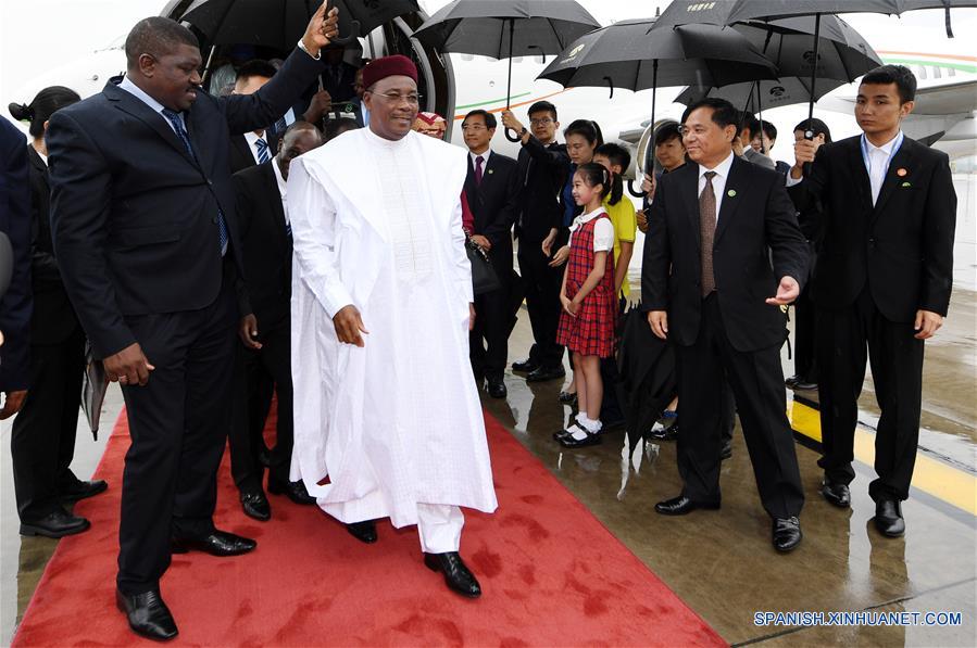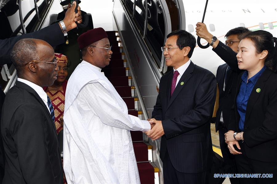 BEIJING, agosto 30, 2018 (Xinhua) -- El presidente de Niger, Mahamadou Issoufou (2-i-frente), llega para asistir a la Cumbre de Beijing del Foro de Cooperación China-Africa (FOCAC), en Beijing, capital de China, el 30 de agosto de 2018. (Xinhua/Ju Huanzong)