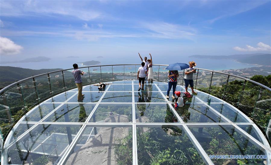 Imagen del 31 de agosto de 2018 de turistas visitando la plataforma del mirador de cristal, una parte de la pasarela de cristal con vista al mar construida en el Parque Forestal Paraíso Tropical de la Bahía de Yanlong, en Sanya, provincia de Hainan, en el sur de China. La pasarela de cristal con vista al mar de 400 metros de largo fue abierta al público recientemente. (Xinhua/Guo Cheng)
