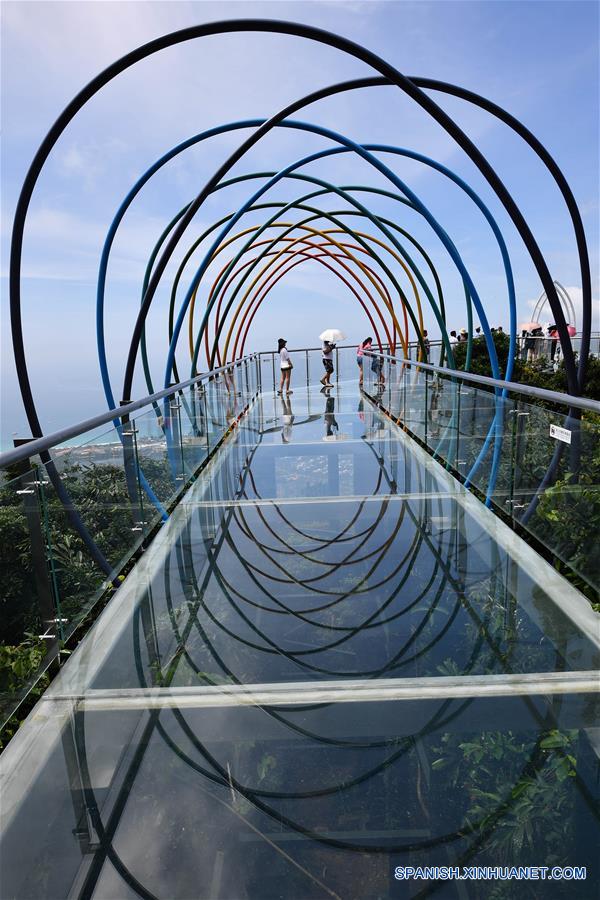 Imagen del 31 de agosto de 2018 de turistas visitando la pasarela de cristal con vista al mar construida en el Parque Forestal Paraíso Tropical de la Bahía de Yanlong, en Sanya, provincia de Hainan, en el sur de China. La pasarela de cristal con vista al mar de 400 metros de largo fue abierta al público recientemente. (Xinhua/Guo Cheng)