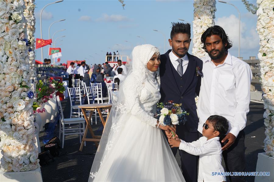 Imagen del 31 de agosto de 2018 de una pareja maldiva participando en una ceremonia de boda masiva en el Puente de Amistad China-Maldivas, en Malé, Maldivas. El Puente de Amistad China-Maldivas, el primer puente marítimo en las Maldivas, abrió al tránsito el jueves por la noche. El puente es un proyecto icónico de las Maldivas y China en la construcción conjunta de la Ruta Marítima de la Seda del Siglo XXI. (Xinhua/Tang Lu)