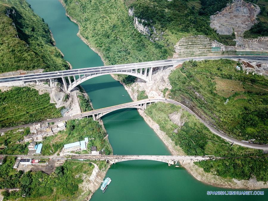 Imagen del 31 de agosto de 2018 de una vista aérea de la sección de Yelanghu del puente de envergadura larga de la Autopista Zhipu (en la parte superior), en el condado de Puding, provincia de Guizhou, en el suroeste de China. La autopista de unos 52 kilómetros de longitud, abierta al tránsito el viernes, une a los condados de Zhijin y Puding. (Xinhua/Tao Liang)
