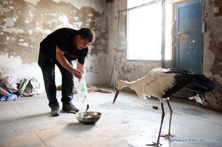 Imagen del 22 de agosto de 2018 de un voluntario alimetando con pescado a una cigüe?a blanca oriental rescatada, en el condado de Lindian de la ciudad de Daqing, provincia de Heilongjiang, en el noreste de China. Una cigüe?a blanca oriental fue encontrada en una fábrica de papel en el condado de Qing'an, Suihua, el 14 de agosto, y trasladada a Lindian por voluntarios para recibir más cuidados. Después de recuperarse, la cigüe?a blanca oriental fue liberada en el bosque el sábado. Las cigüe?as blancas orientales están bajo protección de primer nivel en China. (Xinhua/Wang Kai)