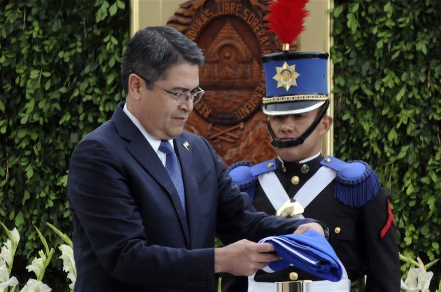 El presidente hondure?o, Juan Orlando Hernández (i), participa en un acto conmemorativo con motivo del Día de la Bandera Nacional, en Tegucigalpa, capital de Honduras, el 1 de septiembre de 2018. De acuerdo con información de la prensa local, este a?o Honduras celebra el 197 aniversario de su independencia. (Xinhua/Rafael Ochoa)