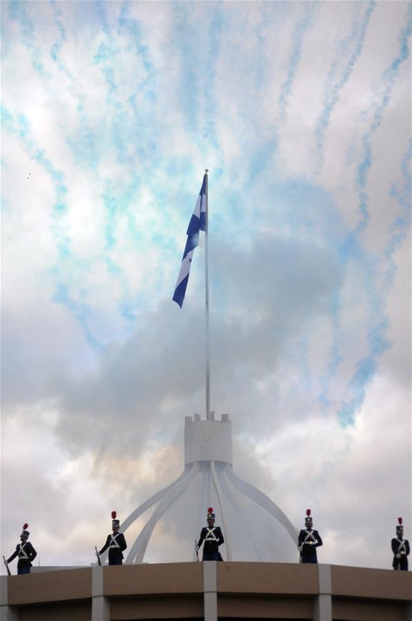 Elementos de la Policía Nacional de Honduras participan en un acto conmemorativo con motivo del Día de la Bandera Nacional, en Tegucigalpa, capital de Honduras, el 1 de septiembre de 2018. De acuerdo con información de la prensa local, este a?o Honduras celebra el 197 aniversario de su independencia. (Xinhua/Rafael Ochoa)