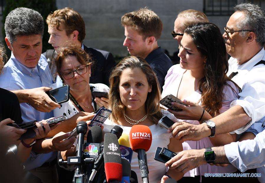 Imagen del 31 de agosto de 2018 de la ministra de Relaciones Exteriores de Canadá, Chrystia Freeland (c), conversando con representantes de los medios de comunicación, en Washington, D.C., Estados Unidos. El presidente de Estados Unidos, Donald Trump, notificó al Congreso su intención de firmar un acuerdo comercial con México y que Canadá será bienvenida a unirse al acuerdo "si está dispuesta", anunció el viernes la Casa Blanca. El anuncio se produce debido a que Estados Unidos y Canadá no lograron llegar el viernes a ningún acuerdo sobre la revisión del Tratado de Libre Comercio de América del Norte (TLCAN) después de varios días de intensas negociaciones. (Xinhua/Liu Jie)