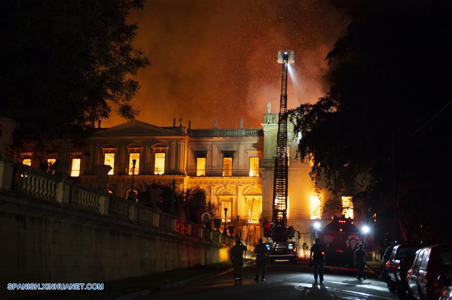 RIO DE JANEIRO, septiembre 2, 2018 (Xinhua) -- Bomberos intentan apagar el incendio en el Museo Nacional de Brasil, en Río de Janeiro, Brasil, el 2 de septiembre de 2018. Un enorme incendio en la noche de este domingo devora el Museo Nacional de Río de Janeiro, la más antigua institución científica de Brasil, con más de 20 millones de piezas. El fuego empezó cuando el museo ya había cerrado las puertas al público por causas por el momento desconocidas. (Xinhua/Celso Pupo/FOTOARENA/ESTADAO CONTEUDO/AGENCIA ESTADO)