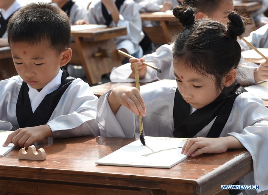 Los estudiantes de primer a?o asisten a la ceremonia inicial de escritura, una actividad educativa de la cultura tradicional china, Nanjing, capital de Jiangsu, 2 de septiembre del 2018. (Foto: Xinhua/ Sun Can)