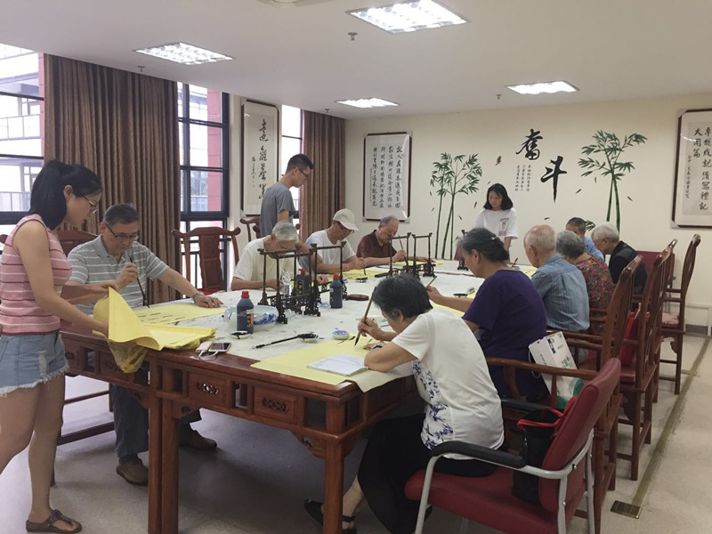 Tres jóvenes residentes ayudan a las personas mayores a practicar caligrafía en el hogar de ancianos Sunshine en Hangzhou, provincia de Zhejiang. CHINA DAILY