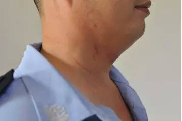 Marcas de cuchillo en el cuello del oficial de policía Huang Qihuan. [Foto: Weibo]