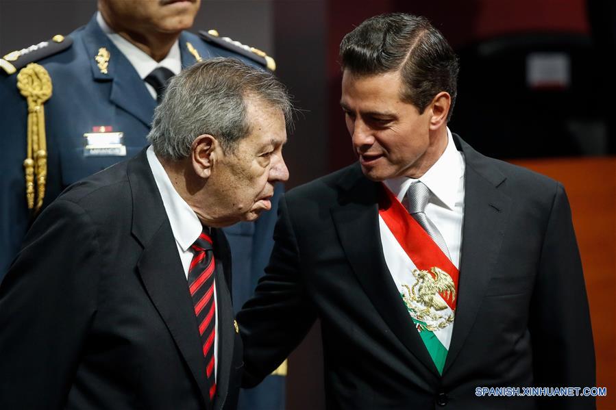 El presidente de México, Enrique Pe?a Nieto (d), acompa?ado del presidente de la Cámara de Diputados, Porfirio Mu?oz Ledo (i), participa durante un mensaje a la nación con motivo de su Sexto Informe de Gobierno, el último de su administración, celebrado en Palacio Nacional, en la Ciudad de México, capital de México, el 3 de septiembre de 2018. (Xinhua/Francisco Ca?edo)