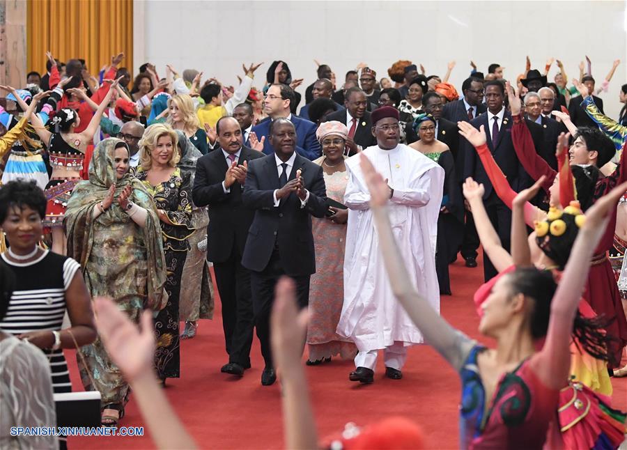 BEIJING, septiembre 3, 2018 (Xinhua) -- Líderes extranjeros y sus cónyuges que asisten a la Cumbre de Beijing 2018 del Foro de Cooperación China-Africa (FOCAC, por sus siglas en inglés) son recibidos por jóvenes artistas en su camino al banquete de bienvenida ofrecido por el presidente de China, Xi Jinping y su esposa Peng Liyuan en el Gran Palacio del Pueblo en Beijing, capital de China, el 3 de septiembre de 2018. (Xinhua/Shen Hong)