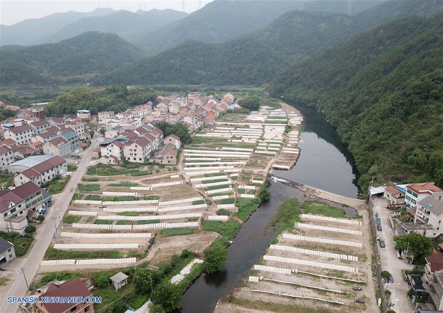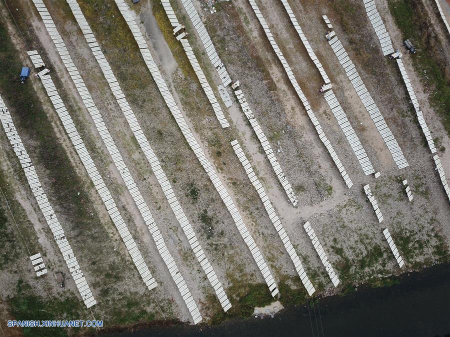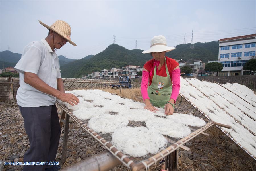 ZHEJIANG, septiembre 4, 2018 (Xinhua) -- Residentes secan los tallarines, en la villa de Dianqian de la ciudad de Shengzhou, provincia de Zhejiang, en el este de China, el 4 de septiembre de 2018. Recientemente, los residentes fabrican y secan tallarines tradicionales a medida que sale el sol todos los días. (Xinhua/Weng Xinyang)
