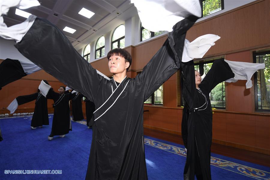 ZHEJIANG, septiembre 4, 2018 (Xinhua) -- Imagen del 3 de septiembre de 2018 de Wang Hongyuan (d-frente) practicando una Opera Yue en la escuela de Opera Yue de Shengzhou, en Shengzhou, en la provincia de Zhejiang, en el este de China. Wang Hongyuan, de 17 a?os de edad, nació en Taizhou, en la provincia de Zhejiang. El es el único estudiante masculino que aprende a realizar el papel de Xiaosheng (rol de hombre joven) en la Opera Yue, en la escuela de Opera Yue de Shengzhou. Los Xiaosheng son generalmente interpretados por mujeres en la Opera Yue, que es una antigua forma de arte originada en Shengzhou y conocida por su lírica y dulces melodías en China. Wang Hongyuan recibió una admisión especial por su talento y fue inscrito cuando estaba en segundo grado de la escuela intermedia. Despúes de duras prácticas, ha participado en algunas presentaciones. (Xinhua/Weng Xinyang)