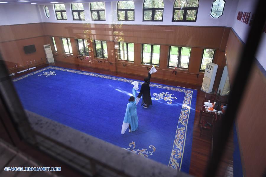 ZHEJIANG, septiembre 4, 2018 (Xinhua) -- Imagen del 3 de septiembre de 2018 de Wang Hongyuan (d) practicando una Opera Yue junto a una compa?era en la escuela de Opera Yue de Shengzhou, en Shengzhou, en la provincia de Zhejiang, en el este de China. Wang Hongyuan, de 17 a?os de edad, nació en Taizhou, en la provincia de Zhejiang. El es el único estudiante masculino que aprende a realizar el papel de Xiaosheng (rol de hombre joven) en la Opera Yue, en la escuela de Opera Yue de Shengzhou. Los Xiaosheng son generalmente interpretados por mujeres en la Opera Yue, que es una antigua forma de arte originada en Shengzhou y conocida por su lírica y dulces melodías en China. Wang Hongyuan recibió una admisión especial por su talento y fue inscrito cuando estaba en segundo grado de la escuela intermedia. Despúes de duras prácticas, ha participado en algunas presentaciones. (Xinhua/Weng Xinyang)