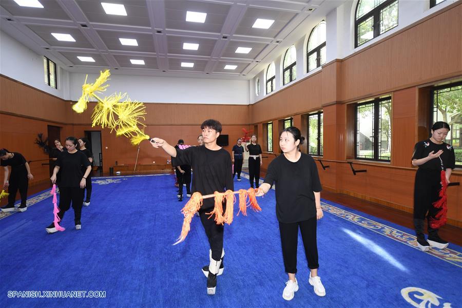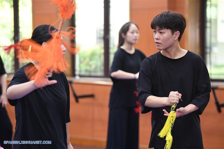 ZHEJIANG, septiembre 4, 2018 (Xinhua) -- Imagen del 3 de septiembre de 2018 de Wang Hongyuan (d) practicando su habilidad con mangas largas en la escuela de Opera Yue de Shengzhou, en Shengzhou, en la provincia de Zhejiang, en el este de China. Wang Hongyuan, de 17 a?os de edad, nació en Taizhou, en la provincia de Zhejiang. El es el único estudiante masculino que aprende a realizar el papel de Xiaosheng (rol de hombre joven) en la Opera Yue, en la escuela de Opera Yue de Shengzhou. Los Xiaosheng son generalmente interpretados por mujeres en la Opera Yue, que es una antigua forma de arte originada en Shengzhou y conocida por su lírica y dulces melodías en China. Wang Hongyuan recibió una admisión especial por su talento y fue inscrito cuando estaba en segundo grado de la escuela intermedia. Despúes de duras prácticas, ha participado en algunas presentaciones. (Xinhua/Weng Xinyang)