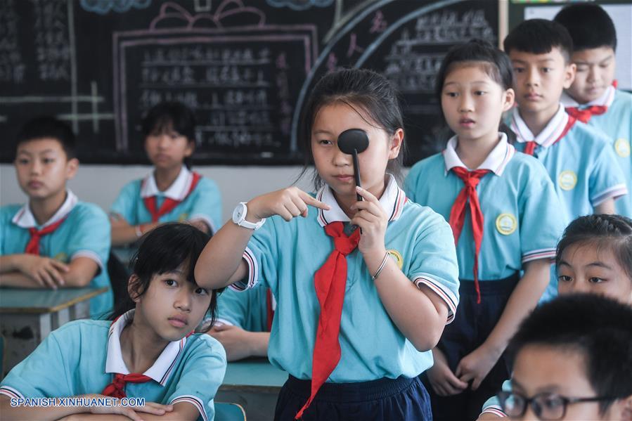 ZHEJIANG, septiembre 4, 2018 (Xinhua) -- Una estudiante verifica su vista en la escuela primaria de Donglin, en el municipio de Donglin de la ciudad de Huzhou, provincia de Zhejiang, en el este de China, el 4 de septiembre de 2018. Las clases están siendo tomadas para popularizar el conocimiento de proteger los ojos ya que China tiene como objetivo frenar el aumento de la miopía entre ni?os y adolescentes. (Xinhua/Xu Yu)