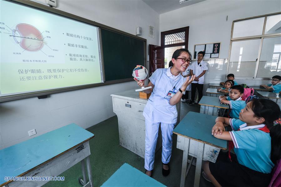 ZHEJIANG, septiembre 4, 2018 (Xinhua) -- Una integrante del personal médico muestra la estructura del ojo y las causas de la miopía a estudiantes en la escuela primaria de Donglin, en el municipio de Donglin de la ciudad de Huzhou, provincia de Zhejiang, en el este de China, el 4 de septiembre de 2018. Las clases están siendo tomadas para popularizar el conocimiento de proteger los ojos ya que China tiene como objetivo frenar el aumento de la miopía entre ni?os y adolescentes. (Xinhua/Xu Yu)