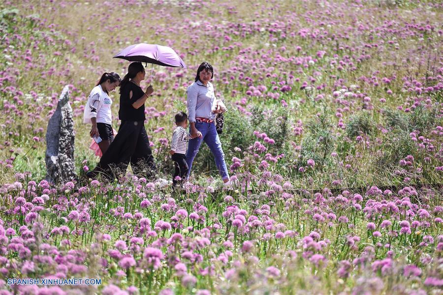 GUIZHOU, septiembre 5, 2018 (Xinhua) -- Turistas observan las flores de cebollino silvestre en un punto escénico, en Liupanshui, provincia de Guizhou, en el suroeste de China, el 5 de septiembre de 2018. (Xinhua/Tao Liang)