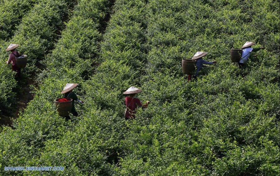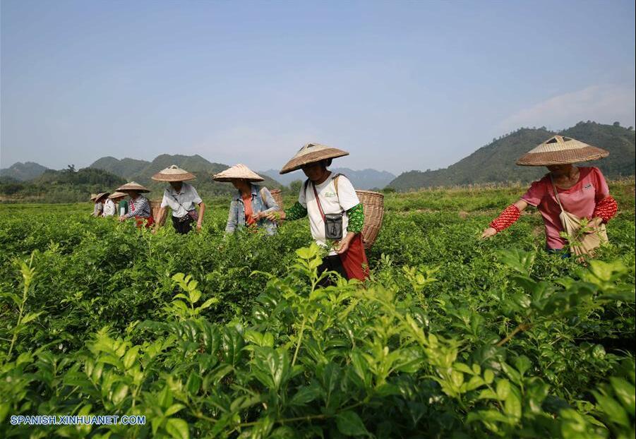 HUNAN, septiembre 5, 2018 (Xinhua) -- Agricultoras recolectan hojas de té en una base en Zhangjiajie, provincia de Hunan, en el centro de China, el 5 de septiembre de 2018. Los campos de té del lugar entraron en la temporada de cosecha de oto?o recientemente. (Xinhua/Wu Yongbing)