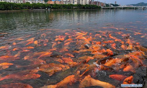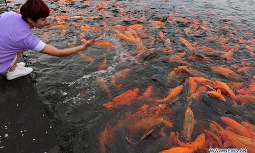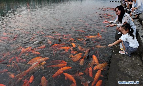 La gente alimenta a los peces del río Tongshanxi en la ciudad de Fuding, provincia de Fujian, sureste de China, el 4 de septiembre de 2018. (Xinhua / Zhang Guojun)