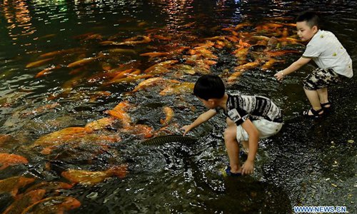Los ni?os juegan con los peces del río Tongshanxi en la ciudad de Fuding, provincia de Fujian, sureste de China, el 4 de septiembre de 2018. (Xinhua / Zhang Guojun)