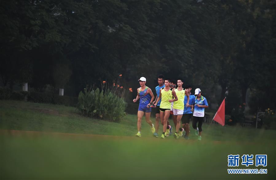 La imagen muestra a los hermanos gemelos y sus compa?eros de equipo haciendo ejercicios matinales de atletismo a las 5:30 de la ma?ana (foto del 16 de agosto). Agencia de Noticias Xinhua, reportero Li Yuze.