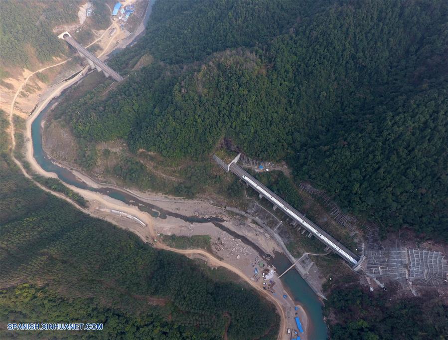 GUANGXI, septiembre 6, 2018 (Xinhua) -- Imagen del 22 de enero de 2018 de un tren bala desplazándose a través del condado de Yongfu, en la Región Autónoma Zhuang de Guangxi, en el sur de China. El kilometraje total de las líneas ferroviarias en la Región Autónoma Zhuang de Guangxi ha alcanzado 5,191 kilómetros de 1,346.3 km en 1958. El ferrocarril se ha convertido en una arteria de transporte y trajo oportunidades económicas a Guangxi. (Xinhua/Lu Boan)