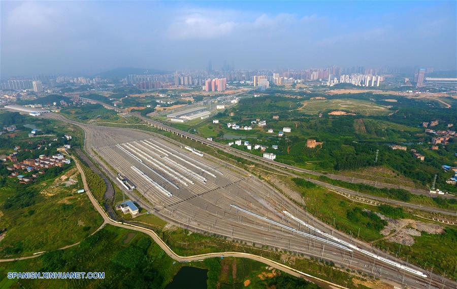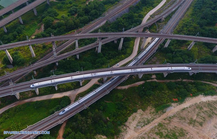 GUANGXI, septiembre 6, 2018 (Xinhua) -- Imagen del 18 de junio de 2018 de una vista aérea de los trenes bala, en Nanning, en la Región Autónoma Zhuang de Guangxi, en el sur de China. El kilometraje total de las líneas ferroviarias en la Región Autónoma Zhuang de Guangxi ha alcanzado 5,191 kilómetros de 1,346.3 km en 1958. El ferrocarril se ha convertido en una arteria de transporte y trajo oportunidades económicas a Guangxi. (Xinhua/Huang Xiaobang)