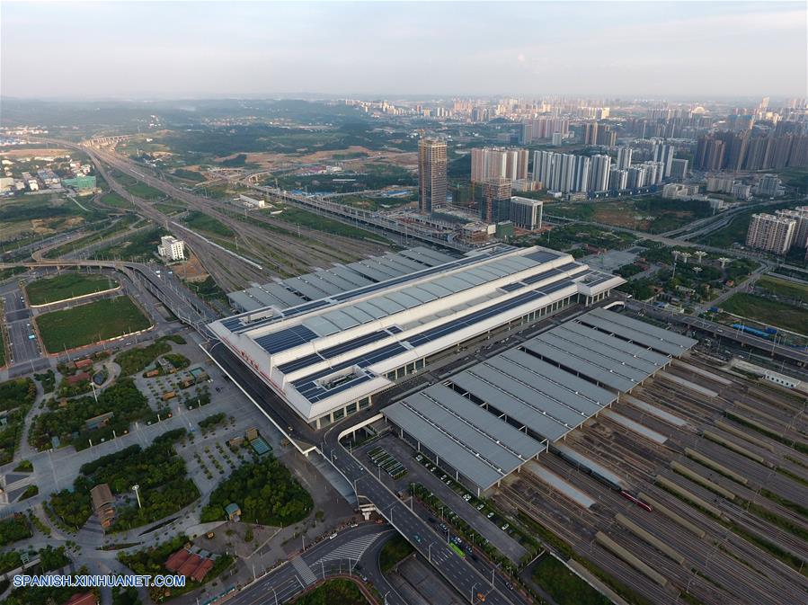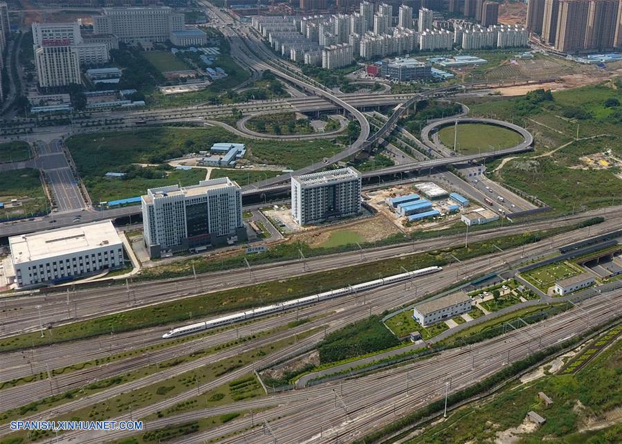 GUANGXI, septiembre 6, 2018 (Xinhua) -- Imagen del 4 de septiembre de 2018 de una vista aérea de la Estación del Ferrocarril de Nanning Este, en Nanning, en la Región Autónoma Zhuang de Guangxi, en el sur de China. El kilometraje total de las líneas ferroviarias en la Región Autónoma Zhuang de Guangxi ha alcanzado 5,191 kilómetros de 1,346.3 km en 1958. El ferrocarril se ha convertido en una arteria de transporte y trajo oportunidades económicas a Guangxi. (Xinhua/Lu Boan)