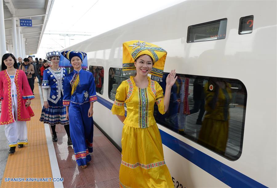 GUANGXI, septiembre 6, 2018 (Xinhua) -- Imagen del 30 de diciembre de 2013 de pasajeras que portan trajes tradicionales preparándose para abordar un tren bala en la Estación del Ferrocarril de Nanning, en Nanning, en la Región Autónoma Zhuang de Guangxi, en el sur de China. El kilometraje total de las líneas ferroviarias en la Región Autónoma Zhuang de Guangxi ha alcanzado 5,191 kilómetros de 1,346.3 km en 1958. El ferrocarril se ha convertido en una arteria de transporte y trajo oportunidades económicas a Guangxi. (Xinhua/Zhou Hua)