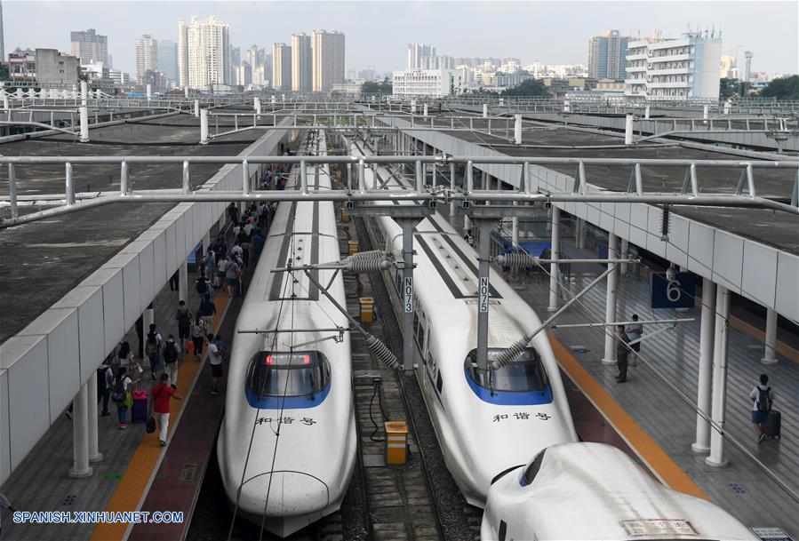 GUANGXI, septiembre 6, 2018 (Xinhua) -- Imagen del 4 de septiembre de 2018 de pasajeros preparandose para abordar los trenes en la Estación del Ferrocarril de Nanning, en Nanning, en la Región Autónoma Zhuang de Guangxi, en el sur de China. El kilometraje total de las líneas ferroviarias en la Región Autónoma Zhuang de Guangxi ha alcanzado 5,191 kilómetros de 1,346.3 km en 1958. El ferrocarril se ha convertido en una arteria de transporte y trajo oportunidades económicas a Guangxi. (Xinhua/Lu Boan)