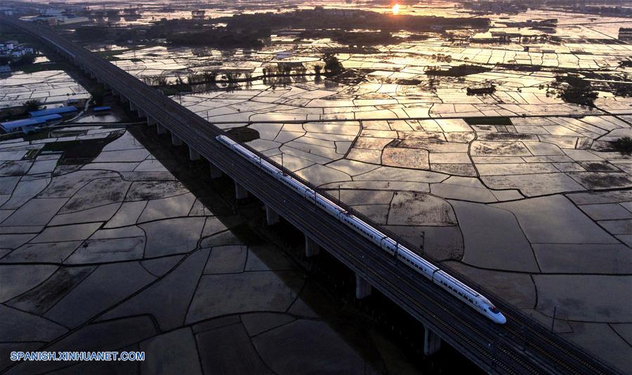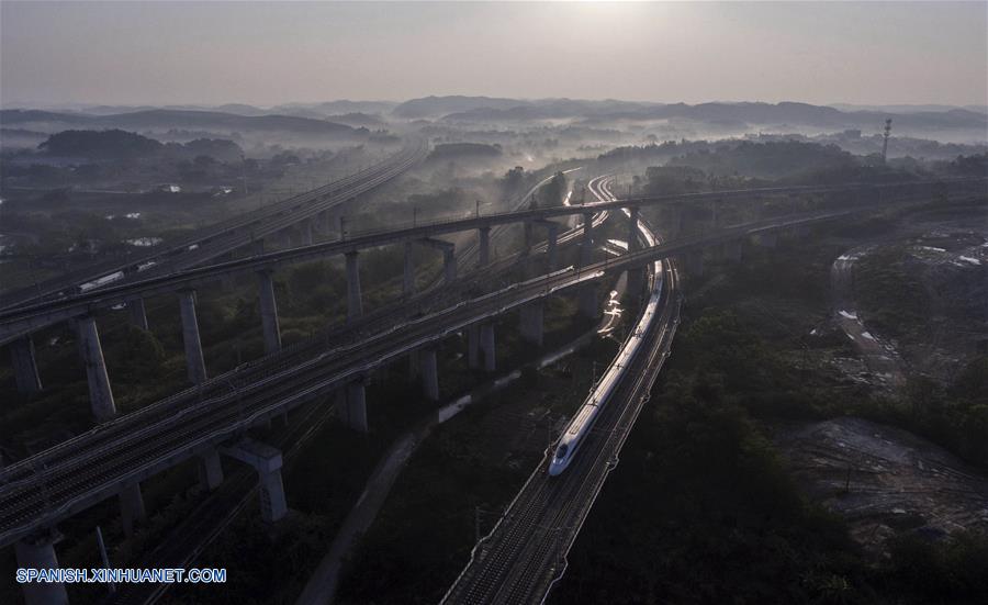 GUANGXI, septiembre 6, 2018 (Xinhua) -- Imagen del 1 de abril de 2017 de un tren bala desplazándose a través del condado de Binyang, en la Región Autónoma Zhuang de Guangxi, en el sur de China. El kilometraje total de las líneas ferroviarias en la Región Autónoma Zhuang de Guangxi ha alcanzado 5,191 kilómetros de 1,346.3 km en 1958. El ferrocarril se ha convertido en una arteria de transporte y trajo oportunidades económicas a Guangxi. (Xinhua/Huang Xiaobang)