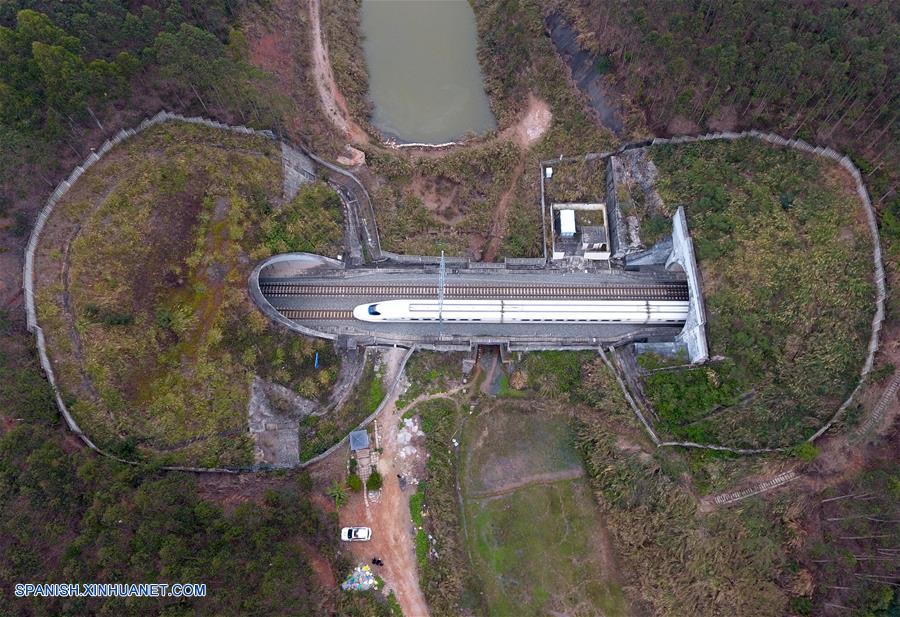GUANGXI, septiembre 6, 2018 (Xinhua) -- Imagen del 11 de febrero de 2018 de un tren bala desplazándose a través de un túnel, en la Región Autónoma Zhuang de Guangxi, en el sur de China. El kilometraje total de las líneas ferroviarias en la Región Autónoma Zhuang de Guangxi ha alcanzado 5,191 kilómetros de 1,346.3 km en 1958. El ferrocarril se ha convertido en una arteria de transporte y trajo oportunidades económicas a Guangxi. (Xinhua/Lu Boan)