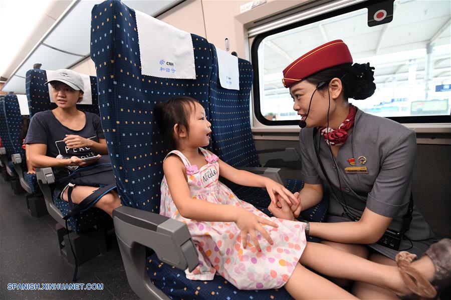 GUANGXI, septiembre 6, 2018 (Xinhua) -- Imagen del 5 de agosto de 2017 de una empleada conversando con una ni?a a bordo de un tren en la Estación del Ferrocarril de Nanning Este, en Nanning, en la Región Autónoma Zhuang de Guangxi, en el sur de China. El kilometraje total de las líneas ferroviarias en la Región Autónoma Zhuang de Guangxi ha alcanzado 5,191 kilómetros de 1,346.3 km en 1958. El ferrocarril se ha convertido en una arteria de transporte y trajo oportunidades económicas a Guangxi. (Xinhua/Lu Boan)