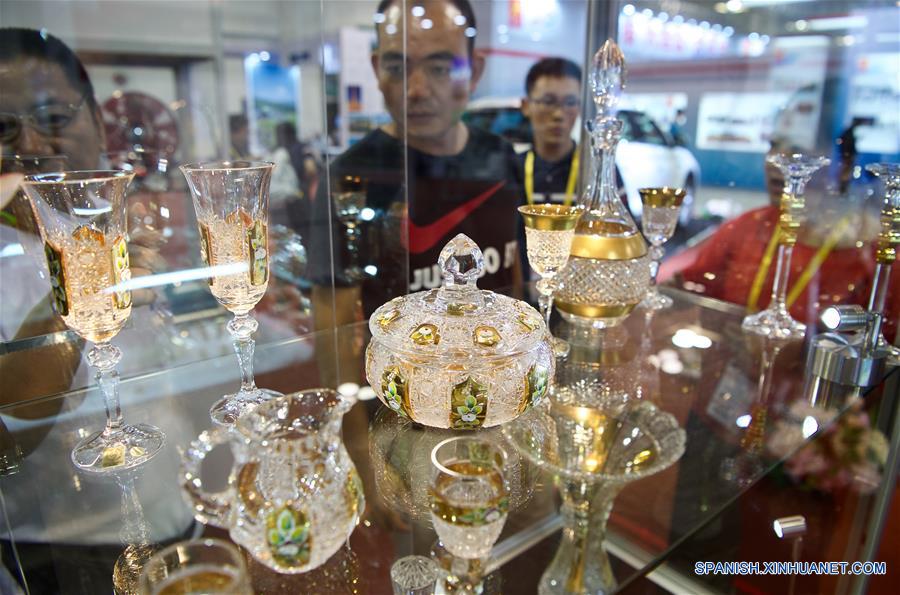FUJIAN, septiembre 8, 2018 (Xinhua) -- Visitantes observan los artefactos de cristal checos en la 20 Feria Internacional de Inversión y Comercio de China, en Xiamen, provincia de Fujian, en el sureste de China, el 8 de septiembre de 2018. (Xinhua/Jiang Kehong)