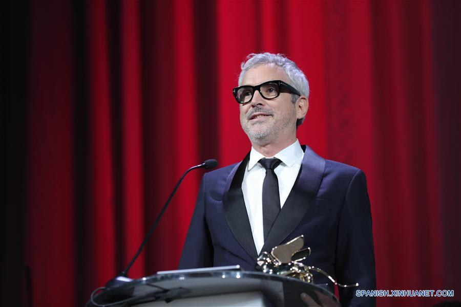 El director mexicano, Alfonso Cuarón, pronuncia un discurso después de ganar el máximo premio en el 75 Festival Internacional de Cine de Venecia, el León de Oro, por su película "Roma", en Venecia, Italia, el 8 de septiembre de 2018. (Xinhua/Cheng Tingting)