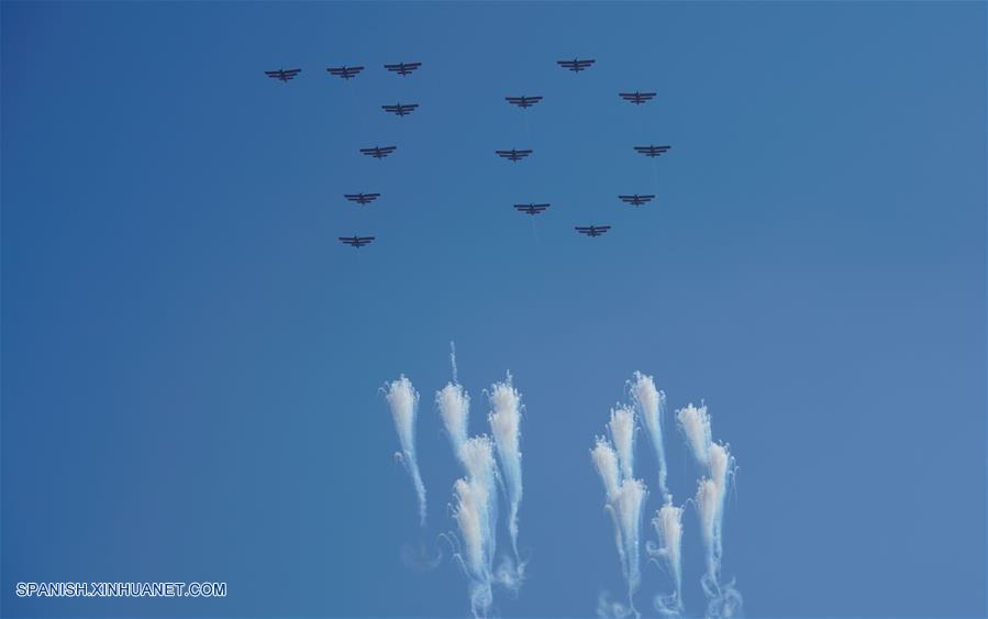 PYONGYANG, septiembre 9, 2018 (Xinhua) -- Aviones dibujan el número "70" en el cielo durante un desfile para celebrar el 70 aniversario de la fundación de la República Popular Democrática de Corea (RPDC), en Pyongyang, RPDC, el 9 de septiembre de 2018. (Xinhua/Xing Guangli)