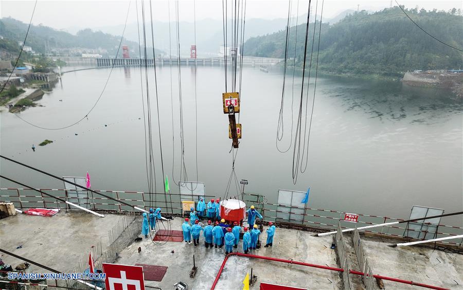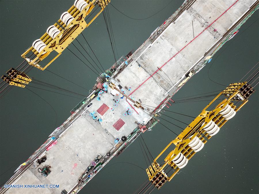 GUIZHOU, septiembre 10, 2018 (Xinhua) -- Trabajadores permanecen en el sitio de construcción del Puente Shatuo sobre el Río Wujiang, en el municipio Qitan del condado de Yanhe, provincia de Guizhou, en el suroeste de China, el 10 de septiembre de 2018. El cierre del arco principal del puente de 626.8 metros de largo concluyó el lunes. (Xinhua/Tao Liang)