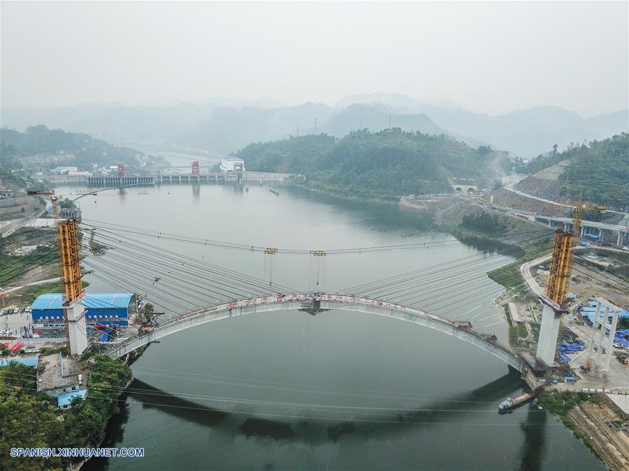 GUIZHOU, septiembre 10, 2018 (Xinhua) -- Vista del sitio de construcción del Puente Shatuo sobre el Río Wujiang, en el municipio Qitan del condado de Yanhe, provincia de Guizhou, en el suroeste de China, el 10 de septiembre de 2018. El cierre del arco principal del puente de 626.8 metros de largo concluyó el lunes. (Xinhua/Tao Liang)