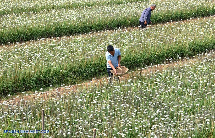 SHANDONG, septiembre 11, 2018 (Xinhua) -- Imagen del 10 de septiembre de 2018 de agricultores recolectando flores de puerro, en la localidad de Lucun de la ciudad de Zibo, provincia de Shandong, en el este de China. (Xinhua/Zhao Dongshan)