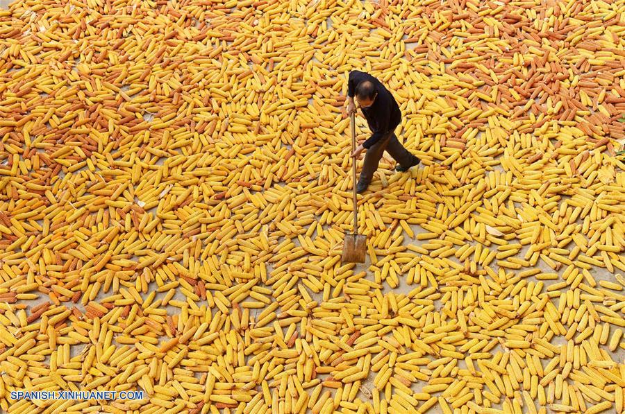 SHANDONG, septiembre 11, 2018 (Xinhua) -- Imagen del 10 de septiembre de 2018 de un agricultor secando el maíz, en la villa de Xipode la ciudad de Zibo, provincia de Shandong, en el este de China. (Xinhua/Zhao Dongshan)