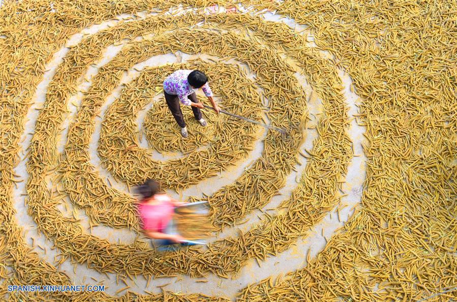 SHANDONG, septiembre 11, 2018 (Xinhua) -- Imagen del 10 de septiembre de 2018 de agricultores secando el grano, en la villa de Dongyuezhuang de la ciudad de Zibo, provincia de Shandong, en el este de China. (Xinhua/Zhao Dongshan)