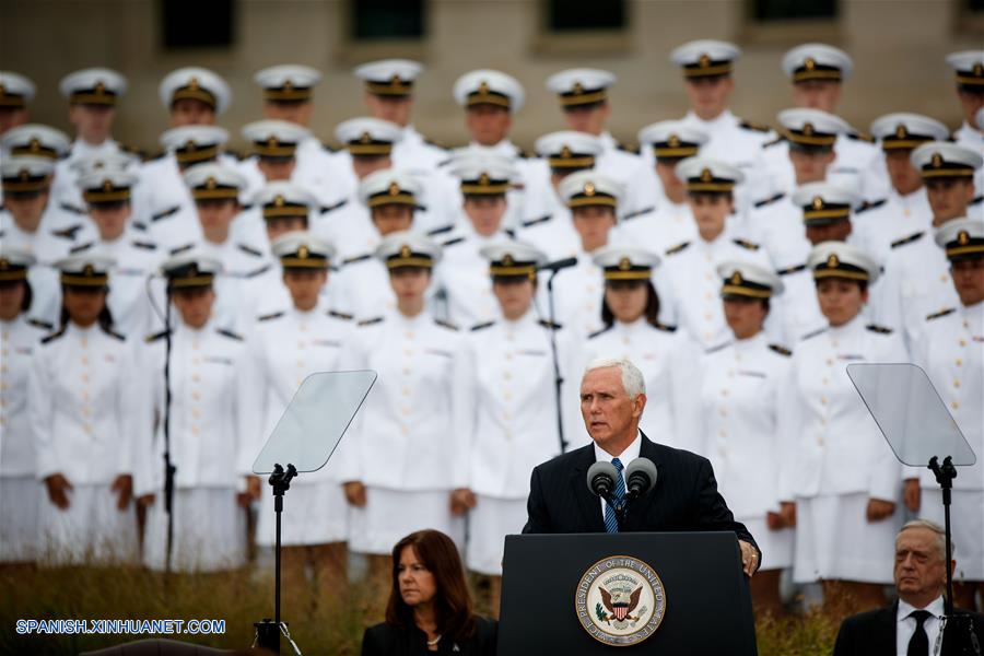 ARLINGTON, septiembre 11, 2018 (Xinhua) -- El vicepresidente estadounidense, Mike Pence (frente), pronuncia un discurso durante una ceremonia con motivo del 17 aniversario de los ataques del 11 de septiembre, en el Pentágono, en Arlington, Virginia, Estados Unidos, el 11 de septiembre de 2018. Con motivo del 17 aniversario de los ataques del 11 de septiembre el martes se realizaron ceremonias conmemorativas alrededor de Estados Unidos. (Xinhua/Ting Shen)