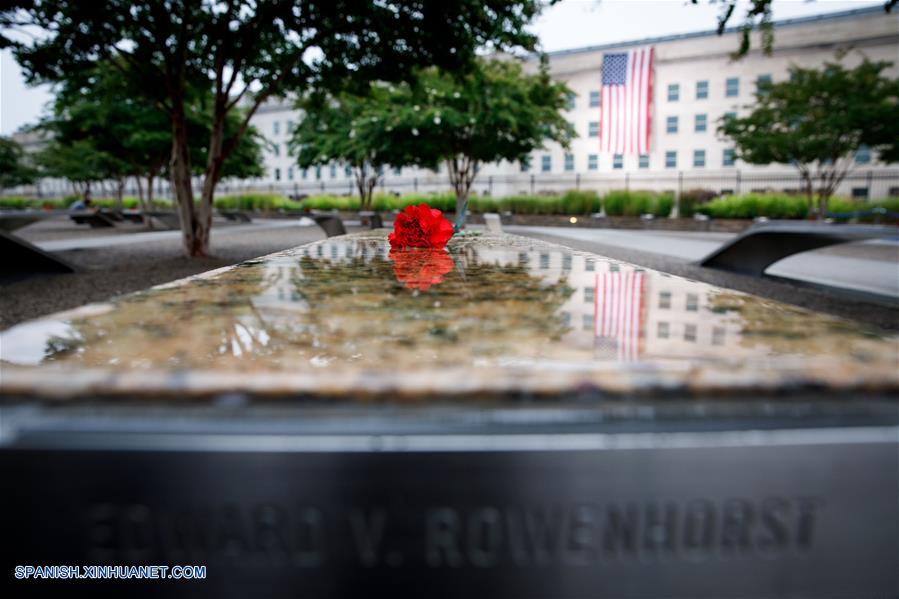 ARLINGTON, septiembre 11, 2018 (Xinhua) -- Una flor permanece en el Memorial del Pentágono durante una ceremonia con motivo del 17 aniversario de los ataques del 11 de septiembre, en Arlington, Virginia, Estados Unidos, el 11 de septiembre de 2018. Con motivo del 17 aniversario de los ataques del 11 de septiembre el martes se realizaron ceremonias conmemorativas alrededor de Estados Unidos. (Xinhua/Ting Shen)