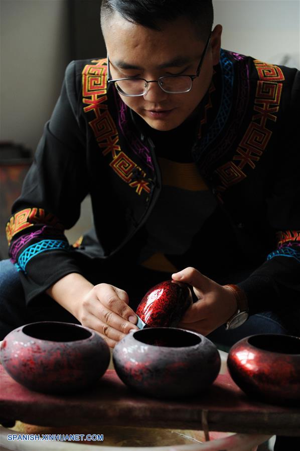 GUIZHOU, septiembre 11, 2018 (Xinhua) -- Imagen del 10 de septiembre de 2018 del heredero Gao Yan elaborando un trabajo de laca, en el condado de Dafang, provincia de Guizhou, en el suroeste de China. El trabajo de laca producido en el condado de Dafang es hecho a mano a través de todos los procedimientos y requiere altos estándares. La técnica de fabricación sólo puede obtenerse de un artesano experimentado. Hoy en día, el gobierno local ha establecido estudios e introducido la artesanía en las tiendas en línea para la herencia del arte. (Xinhua/Yang Wenbin)