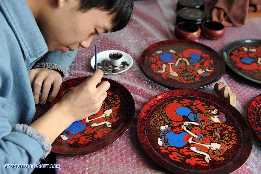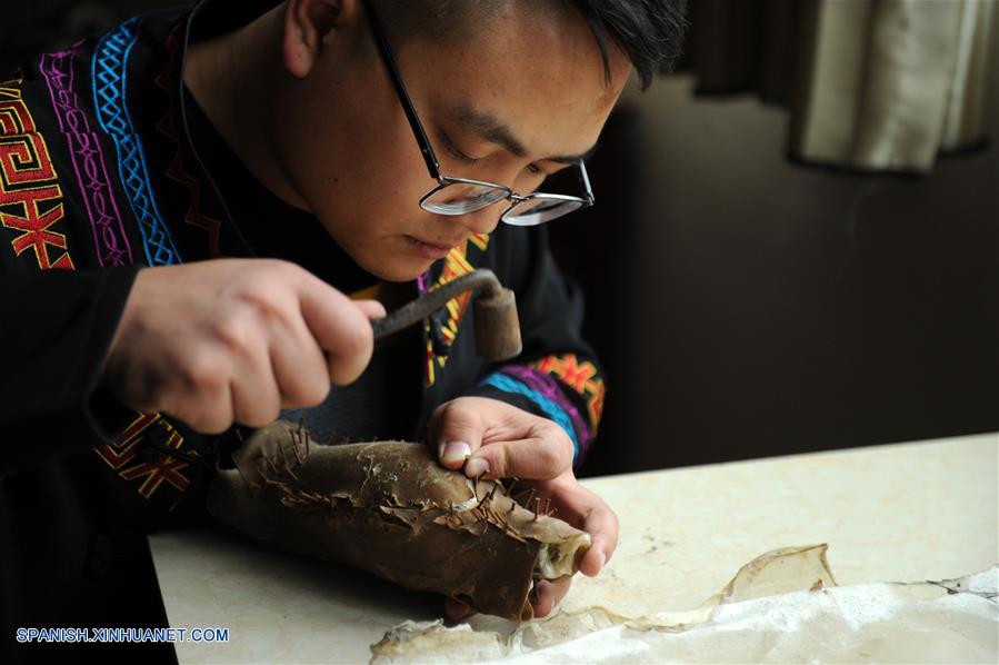 GUIZHOU, septiembre 11, 2018 (Xinhua) -- Imagen del 10 de septiembre de 2018 de un artesano elaborando trabajos de laca, en el condado de Dafang, provincia de Guizhou, en el suroeste de China. El trabajo de laca producido en el condado de Dafang es hecho a mano a través de todos los procedimientos y requiere altos estándares. La técnica de fabricación sólo puede obtenerse de un artesano experimentado. Hoy en día, el gobierno local ha establecido estudios e introducido la artesanía en las tiendas en línea para la herencia del arte. (Xinhua/Yang Wenbin)