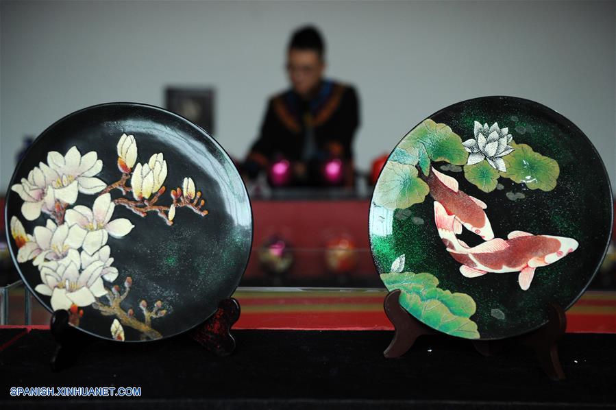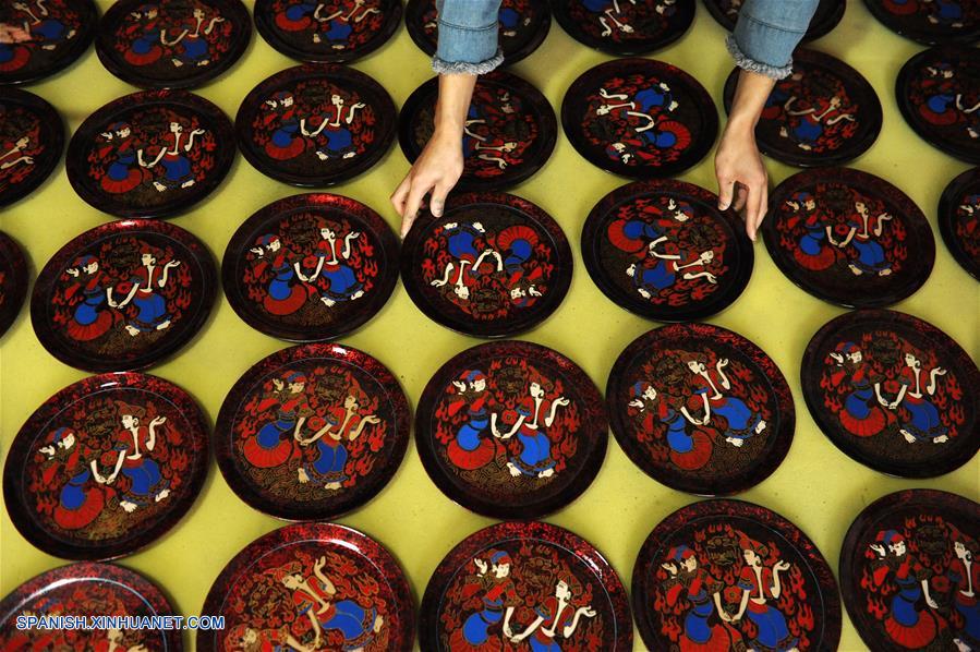 GUIZHOU, septiembre 11, 2018 (Xinhua) -- Imagen del 10 de septiembre de 2018 de una vista de trabajos de laca exhibidos en una fábrica, en el condado de Dafang, provincia de Guizhou, en el suroeste de China. El trabajo de laca producido en el condado de Dafang es hecho a mano a través de todos los procedimientos y requiere altos estándares. La técnica de fabricación sólo puede obtenerse de un artesano experimentado. Hoy en día, el gobierno local ha establecido estudios e introducido la artesanía en las tiendas en línea para la herencia del arte. (Xinhua/Yang Wenbin)